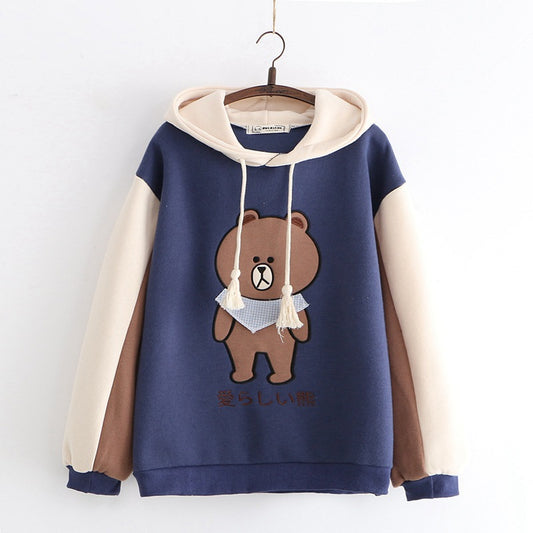 Merry Pretty Women Harajuku Cartoon Bear Embroidery Hooded Sweat Winter Plus Velvet Cute Sweat Tracksuit