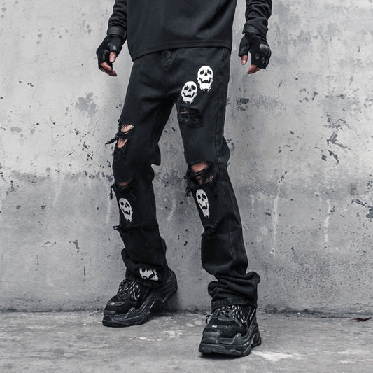 Vaqueros desgastados con calavera y tibias cruzadas para hombre