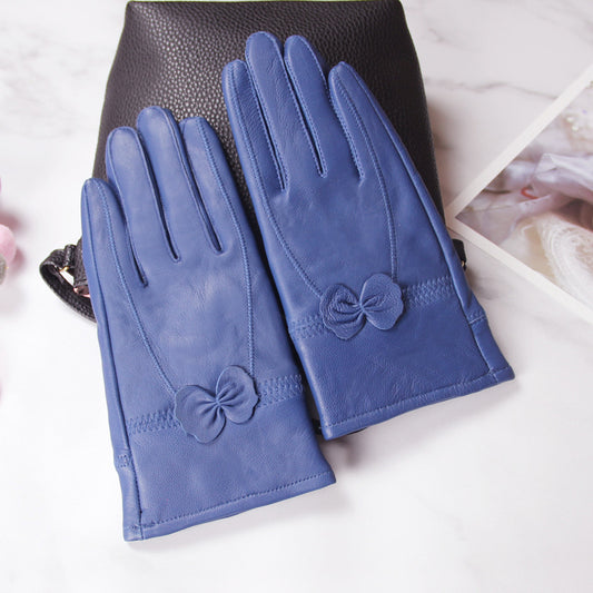 Guantes de cuero de oveja para otoño e invierno, guantes de cuero cálidas de terciopelo para mujer, bonito lazo rojo frío para conducir